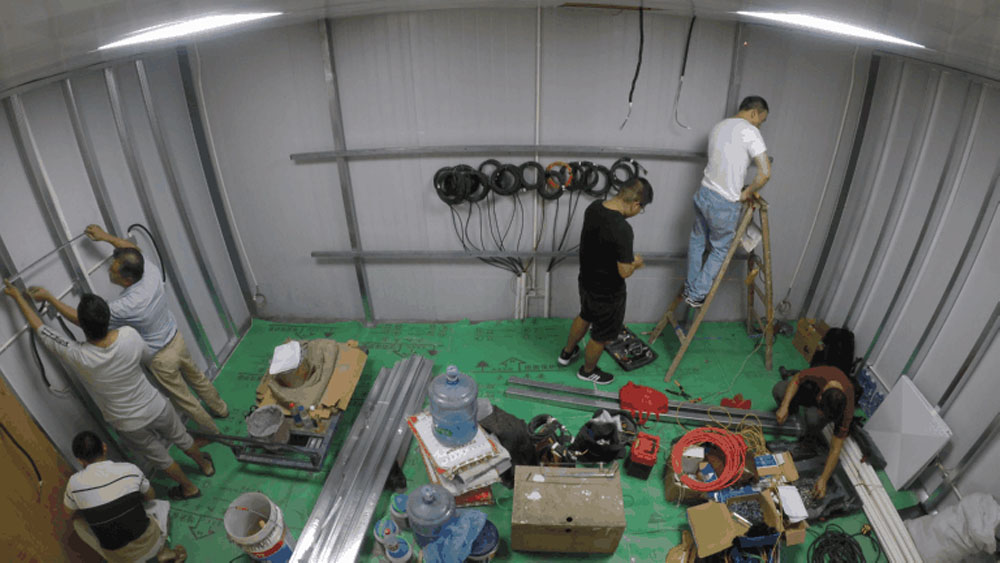 緊接著是封墻及搭建龍骨架,展廳初現雛形