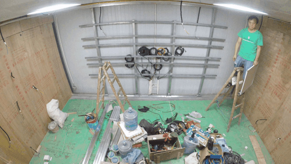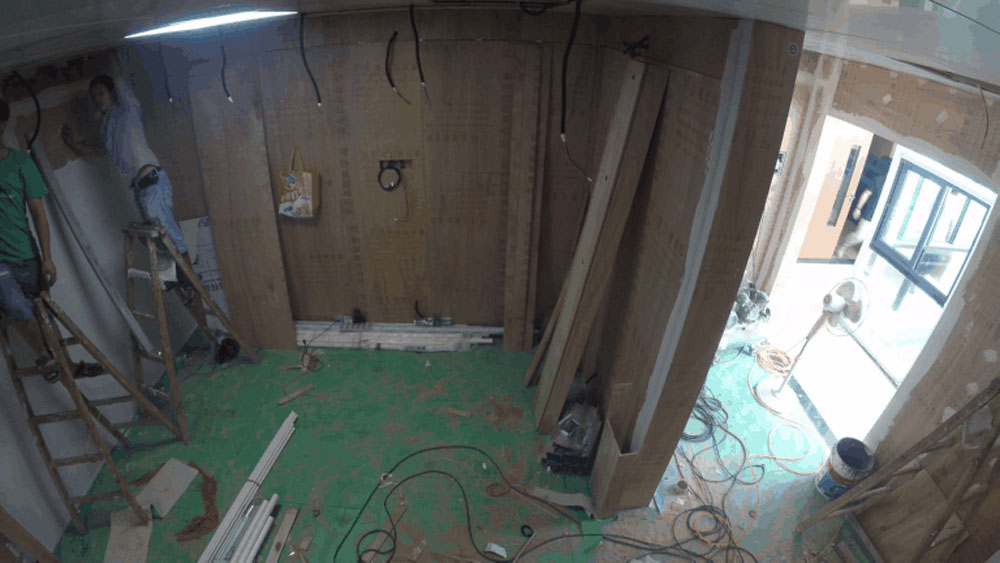 墻面基本工作完成后,開始進行墻面修飾,噴繪高清貼畫,并對LED電路、天花板氛圍燈進行鋪設,以及烤漆構建安裝工作