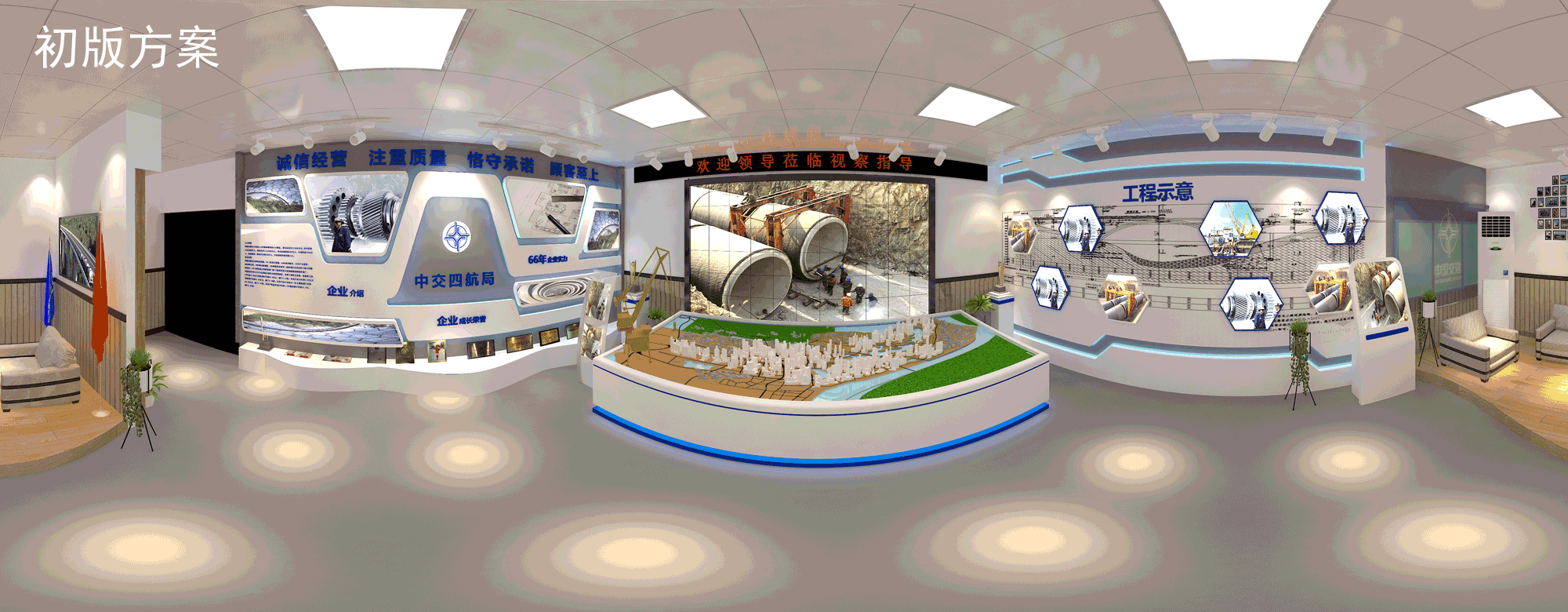 高清LED拼接幕墻,精細化動態沙盤模型,高精質巨型項目噴繪,VR創新技術應用,整合多種傳播媒介,融合企業特色文化、企業榮譽實力展示、項目工藝創新等元素,實力打造多媒體互動沉浸式體驗,360°全方位展示工程實況。